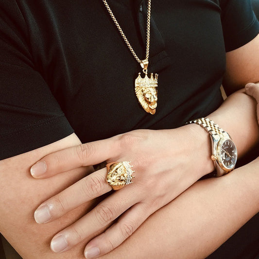 Regular price $36.00 USDRegular priceUnit price / perSale price $36.00 USDPunk Lion Head Necklace Pendant Ring Set, Gold